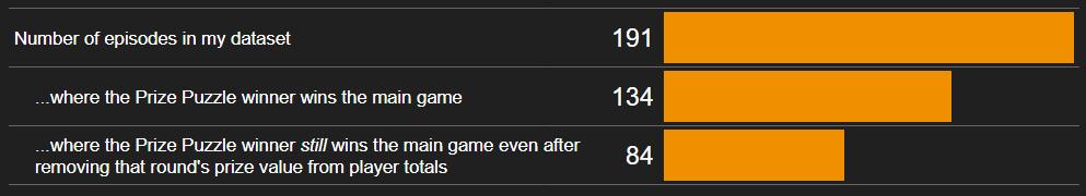 The number of Prize Puzzle winners who win the main game goes down a lot in this scenario: from 134 down to 84 as of this writing, or about 63% as often. To sum up: