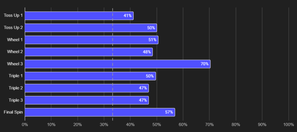 Let’s start with the basics. With three players, each player begins the show with a ~33% chance of being the big winner. A player’s chance of winning then goes up and down throughout the Toss Ups and wheel rounds. Solving any puzzle, whether a wheel round or a Toss Up, will increase someone’s chance of winning the whole game. If we knew nothing about a player’s performance other than “This player won Round X,” what would that tell us about that player’s chance of winning the whole game?